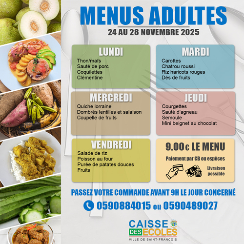 Découvrez les menus pour adultes proposés par le service de la restauration scolaire de Saint-François pour la semaine du 24 au 28 novembre 2025