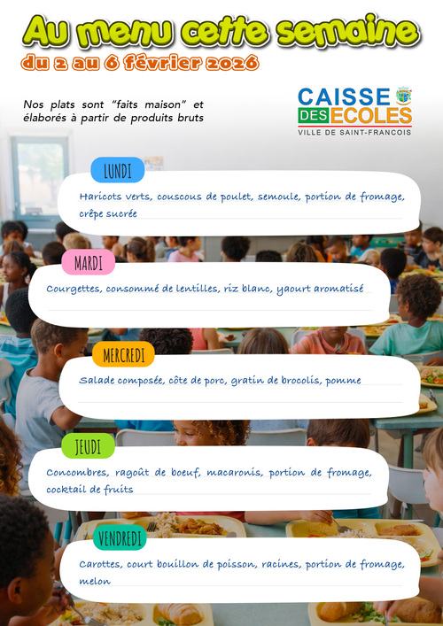 Découvrez le menu des écoles de Saint-François pour la semaine du 2 au 6 février 2026
