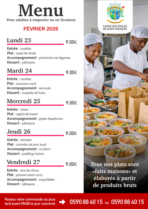 Découvrez les menus pour adultes proposés par le service de la restauration scolaire de Saint-François pour la semaine du 23 au 27 février 2026