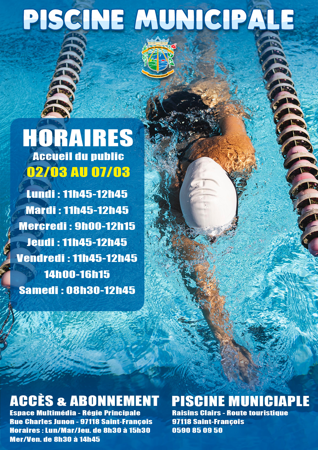 Découvrez les horaires d’accueil du public de la piscine municipale pour la semaine du 2 au 7 mars 2026