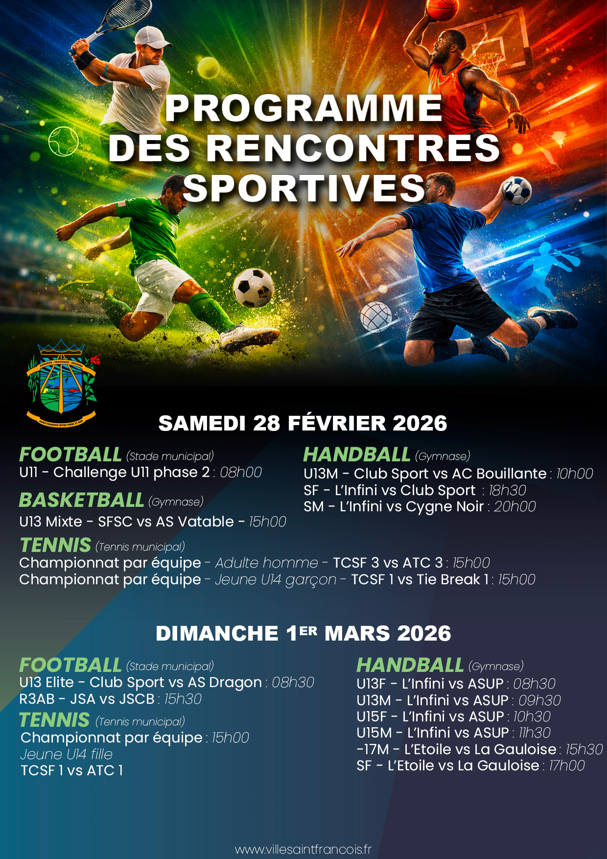 Découvrez le programme des rencontres sportives du week-end du 28 février et 1er mars 2026 à Saint-François