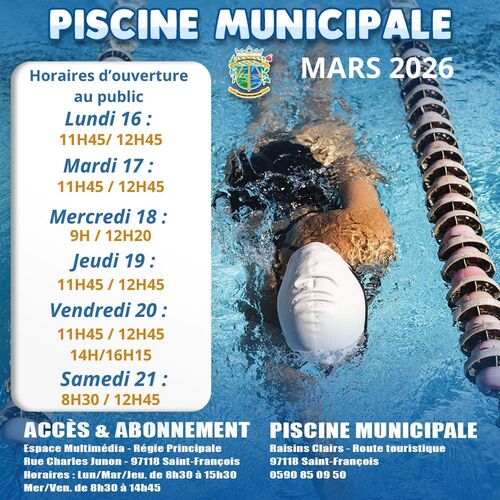 Découvrez les horaires d’accueil du public de la piscine municipale pour la semaine du 16 au 21 mars 2026.