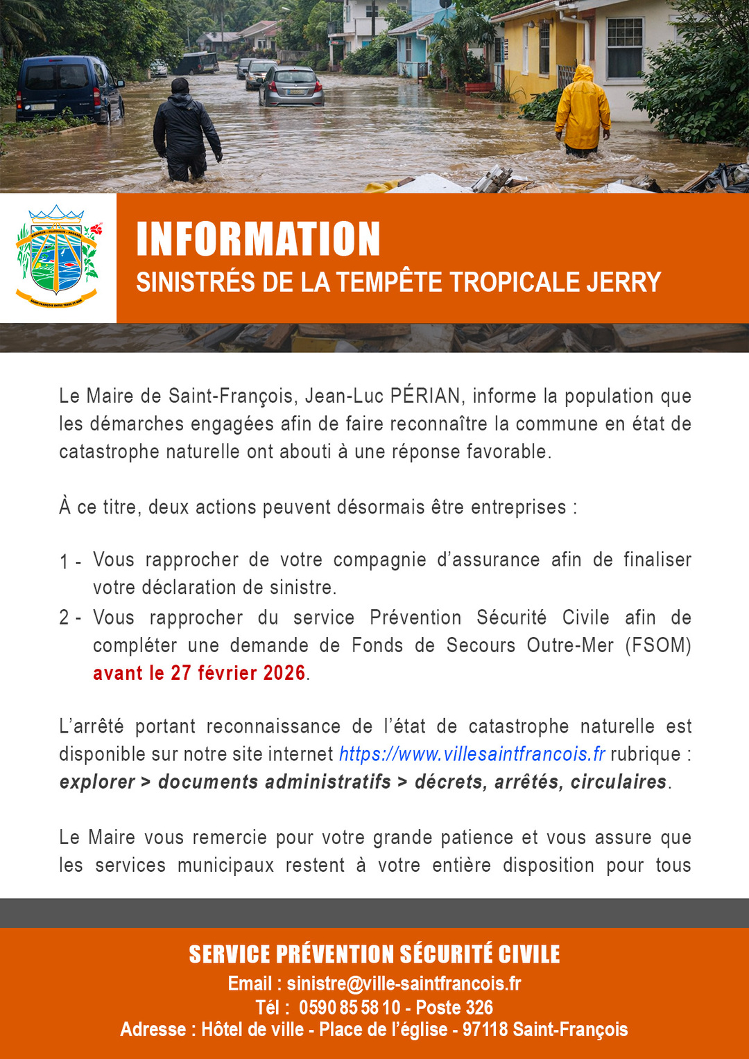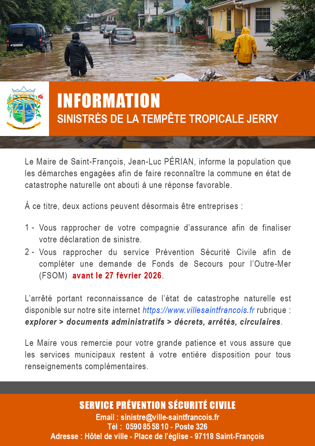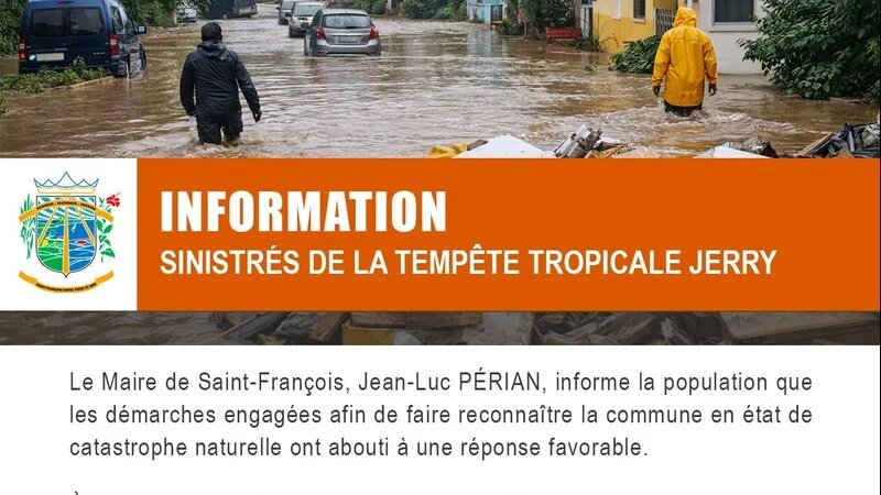 Le Maire de Saint-François, Jean-Luc PÉRIAN, informe la population que les démarches engagées afin de faire reconnaître la commune en état de catastrophe naturelle ont abouti à une réponse favorable.