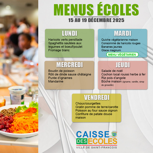 Découvrez le menu des écoles de Saint-François pour la semaine du 15 au 19 décembre 2025