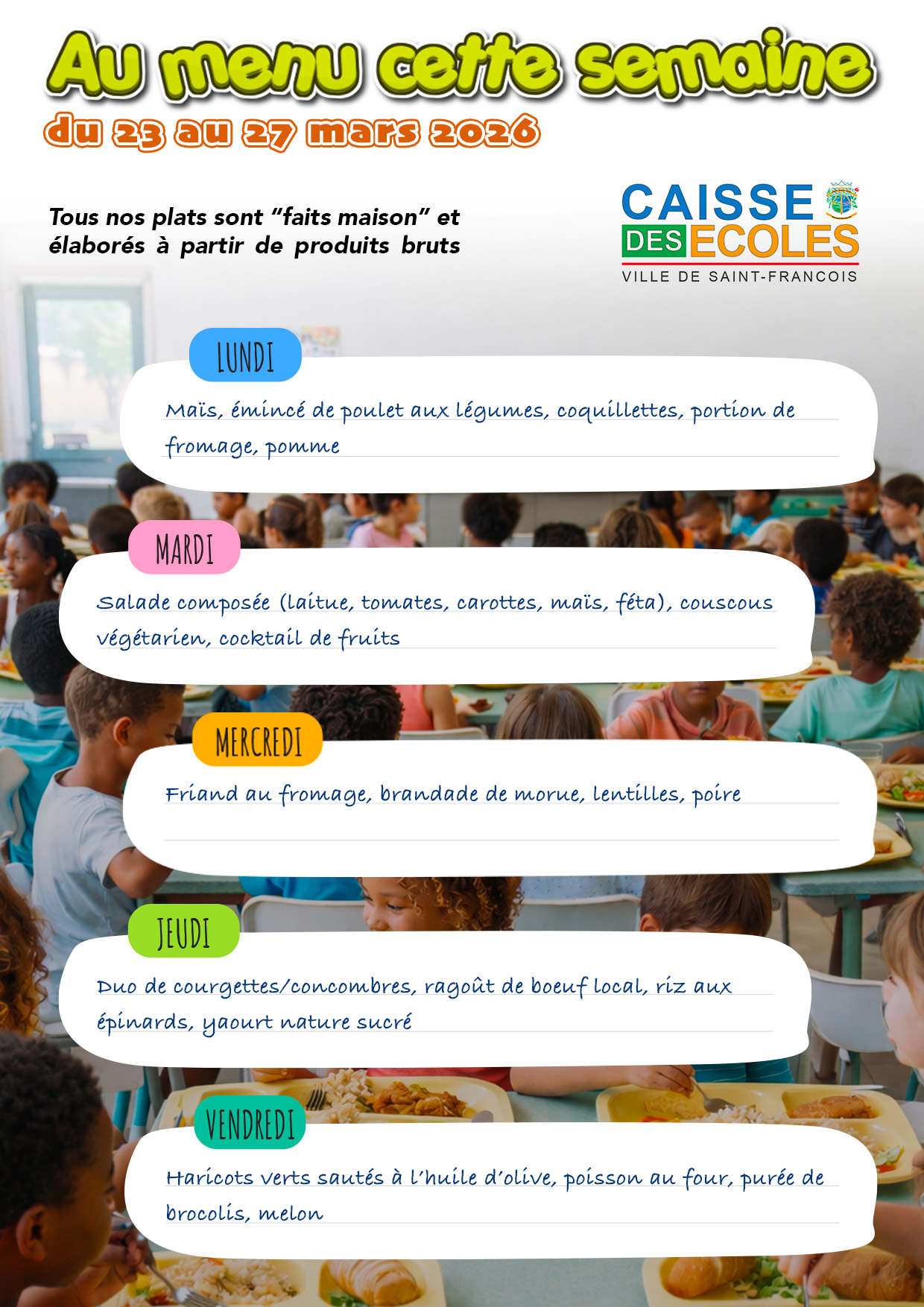 Découvrez le menu des écoles de Saint-François pour la semaine du 23 au 27 mars 2026.