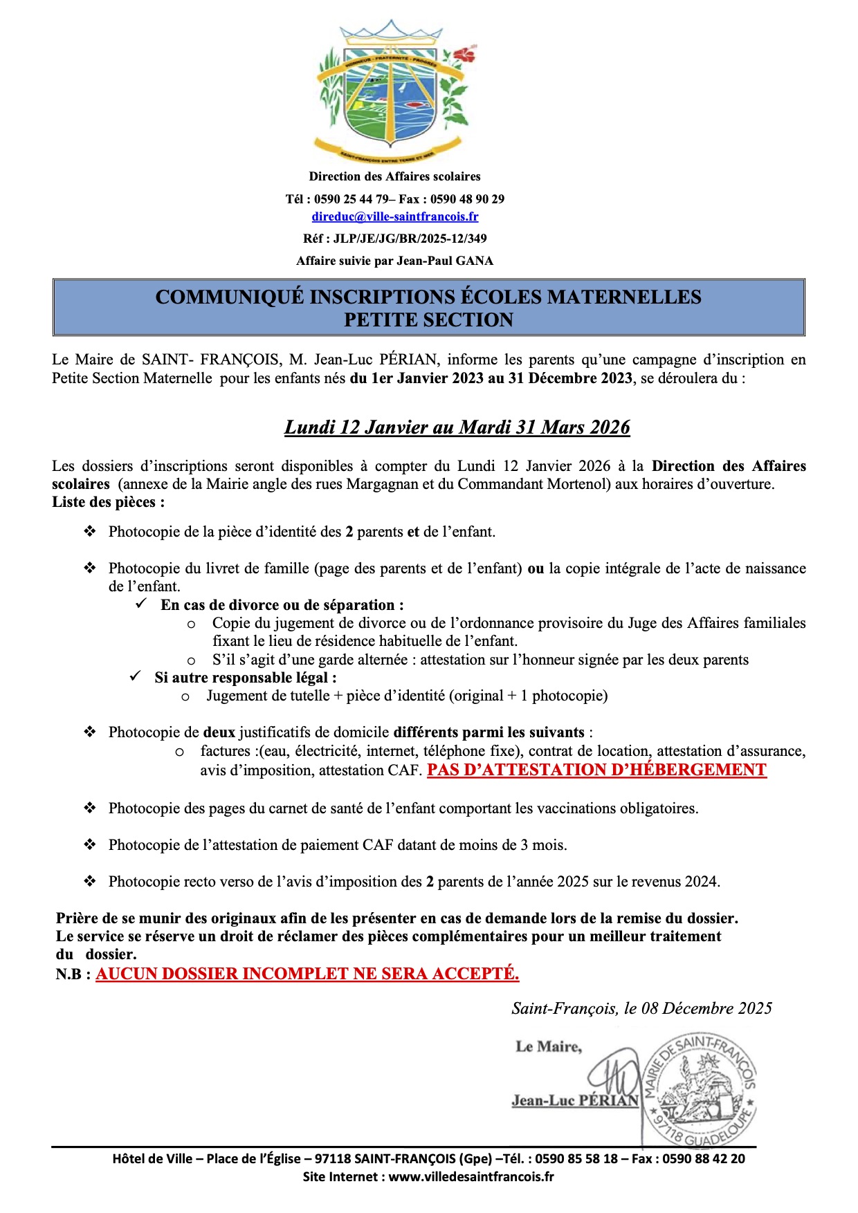 📌Vous pourrez retirer vos dossiers d’inscriptions à compter du Lundi 12 Janvier au bureau de la Direction de l’Education situé à l’angle des rues Margagnan et du Commandant Mortenol).