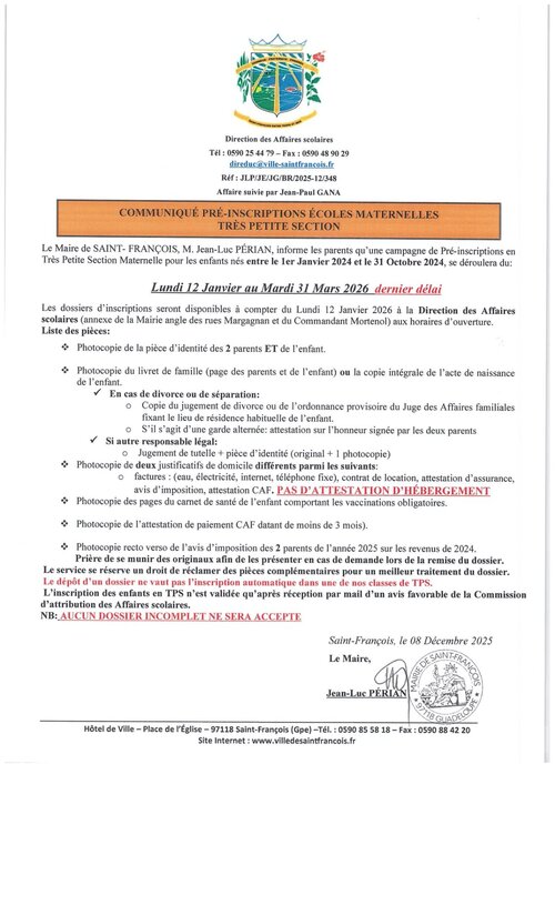 📌Vous pourrez retirer vos dossiers d’inscriptions à compter du Lundi 13 Janvier au bureau de la Direction de l’Education situé à l’angle des rues Margagnan et du Commandant Mortenol).