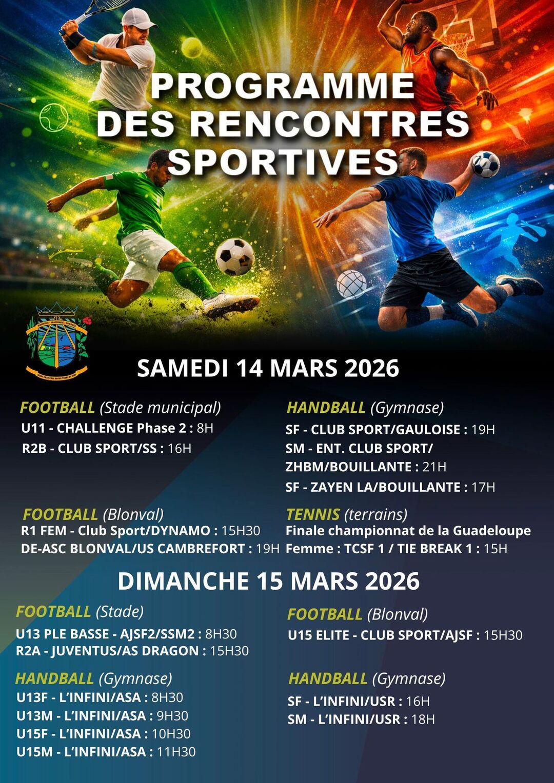 Découvrez le programme des rencontres sportives du week-end du 14 et 15 mars 2026.
