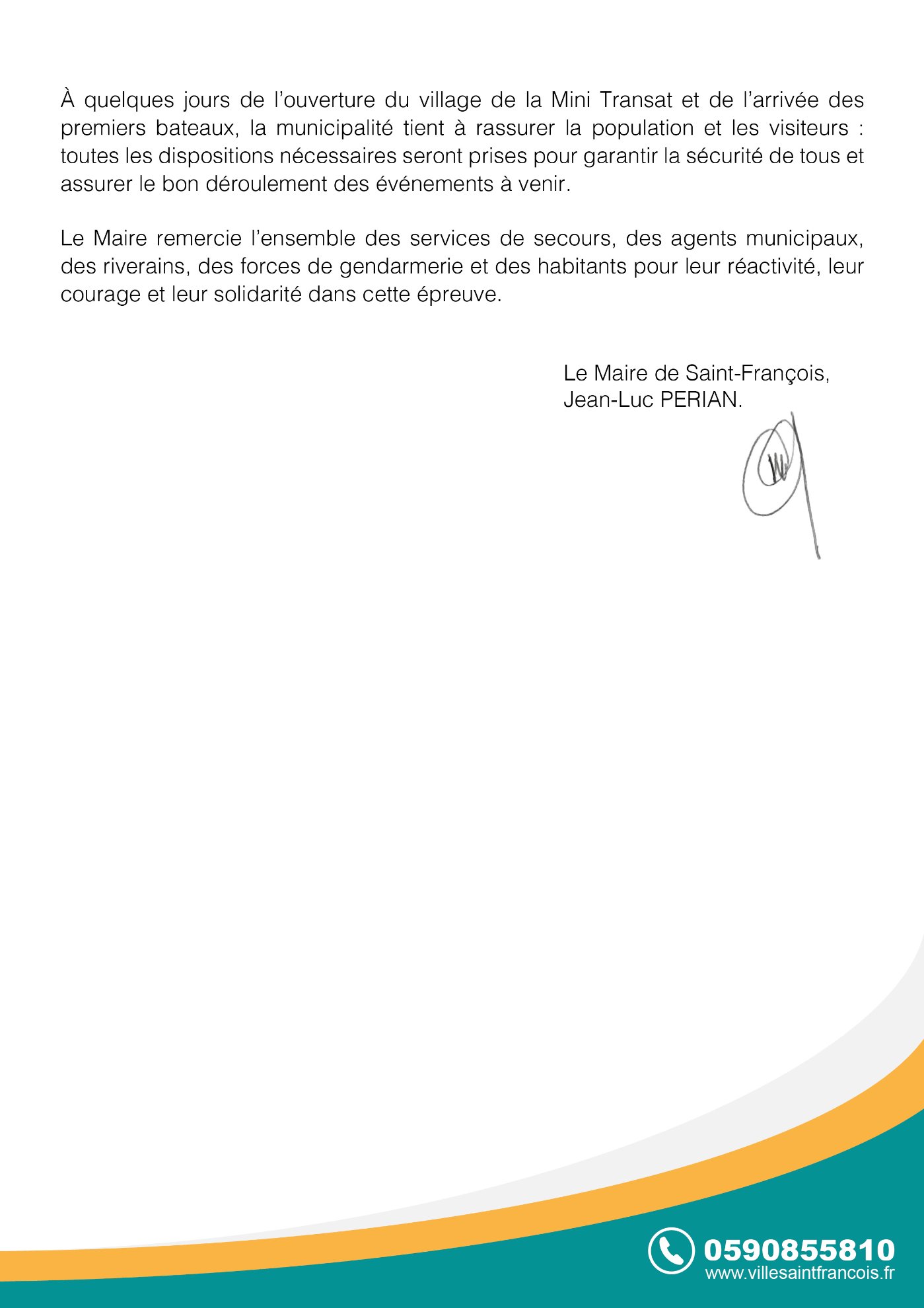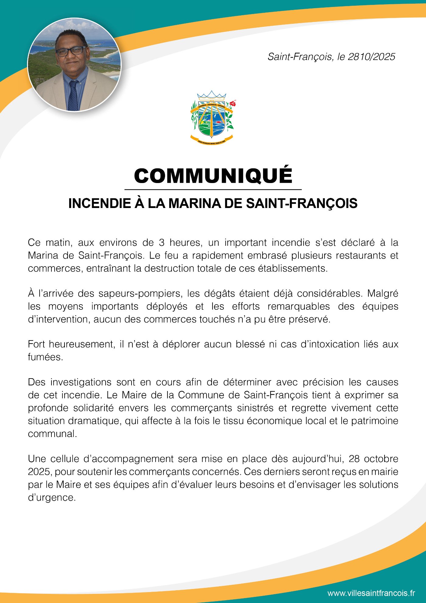 Des investigations sont en cours afin de déterminer avec précision les causes de cet incendie. Le Maire de la Commune de Saint-François tient à exprimer sa profonde solidarité envers les commerçants sinistrés et regrette vivement cette situation dramatique, qui affecte à la fois le tissu économique local et le patrimoine communal.