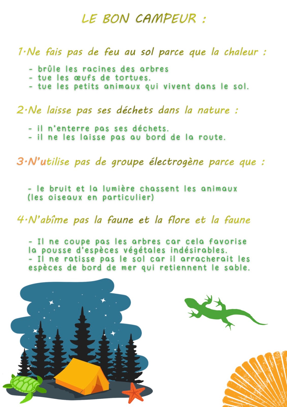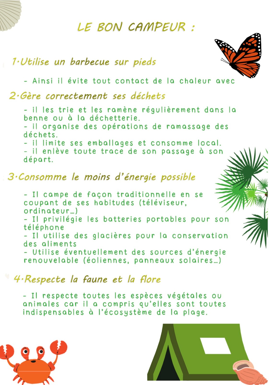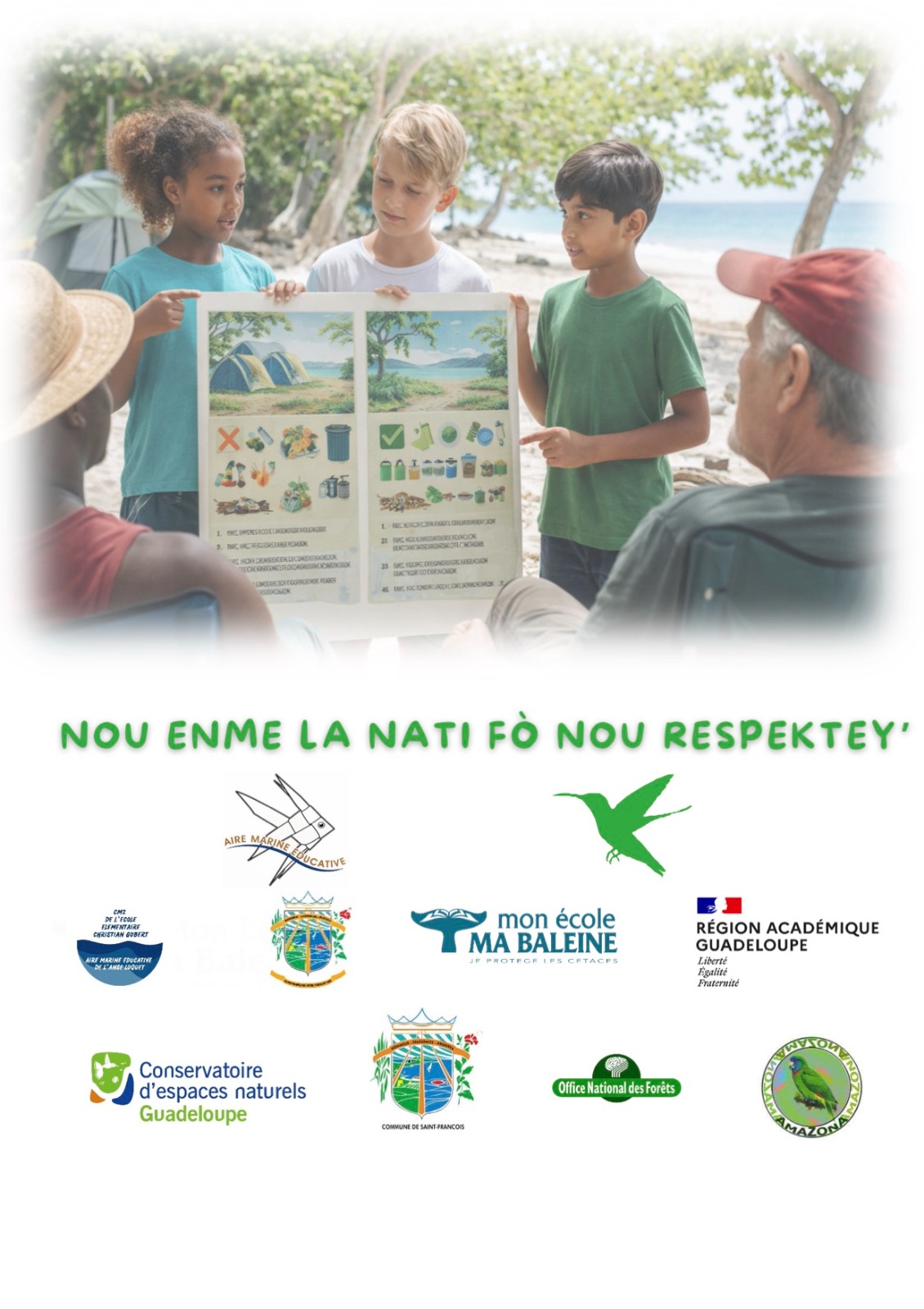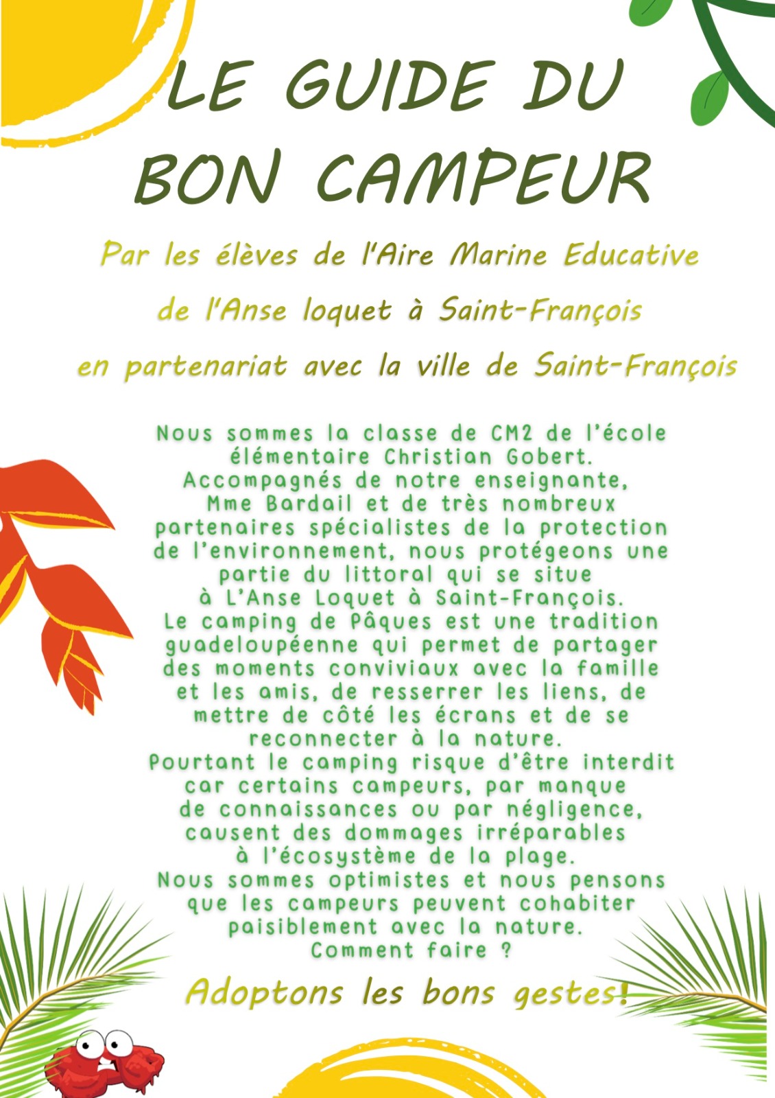 Dans le cadre de l’Aire Marine Educative (AME) de l’Anse Loquet à Saint-François et accompagnés par leur enseignante Mme BARDAIL, les élèves de CM2 de l’école Christian GOBERT ont réalisé un support rappelant les bons gestes à adopter pour que le camping durant Pâques soit un moment convivial mais dans le respect notre environnement.