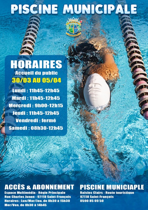 Découvrez les horaires de la piscine municipale de Saint-François pour la semaine du 30 mars ou 5 avril 2026.