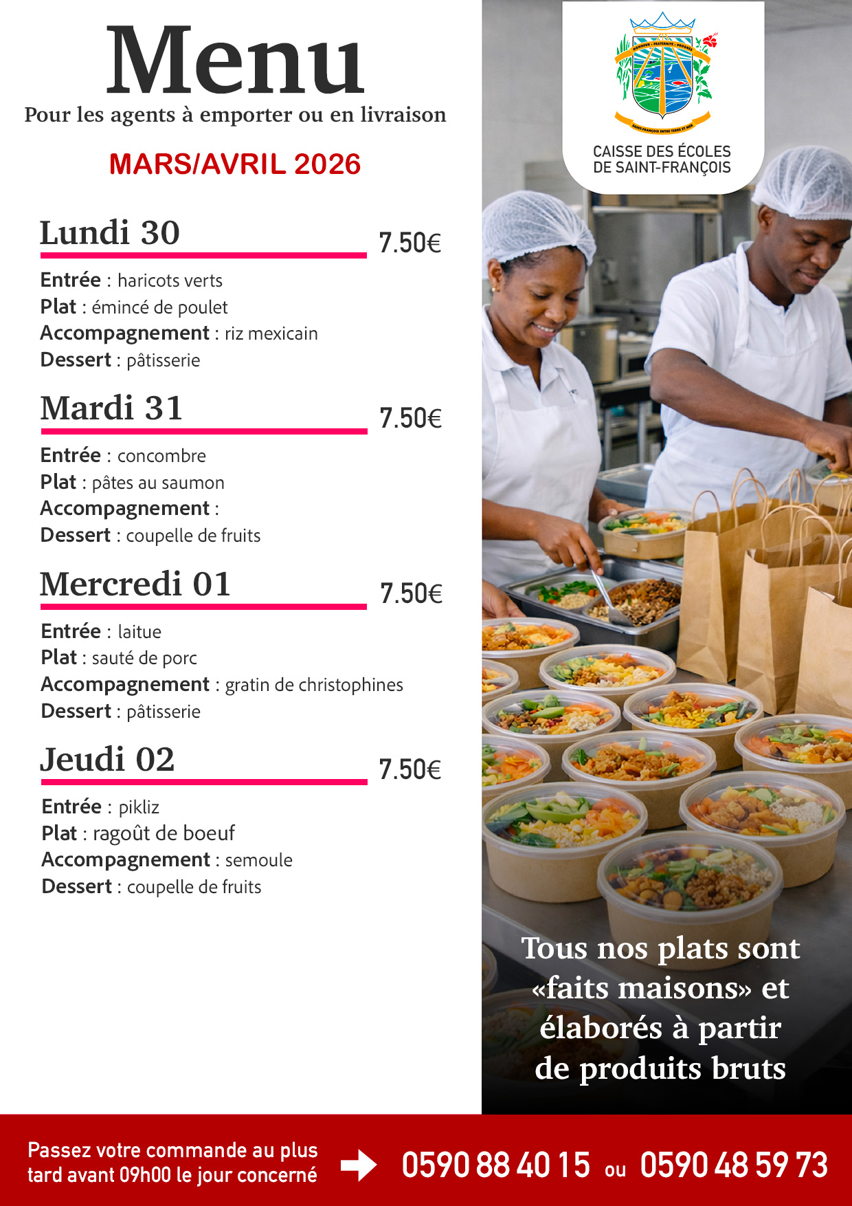 Découvrez les menus pour adultes proposés par le service de la restauration scolaire de Saint-François pour la semaine du 30 mars au 2 avril 2026