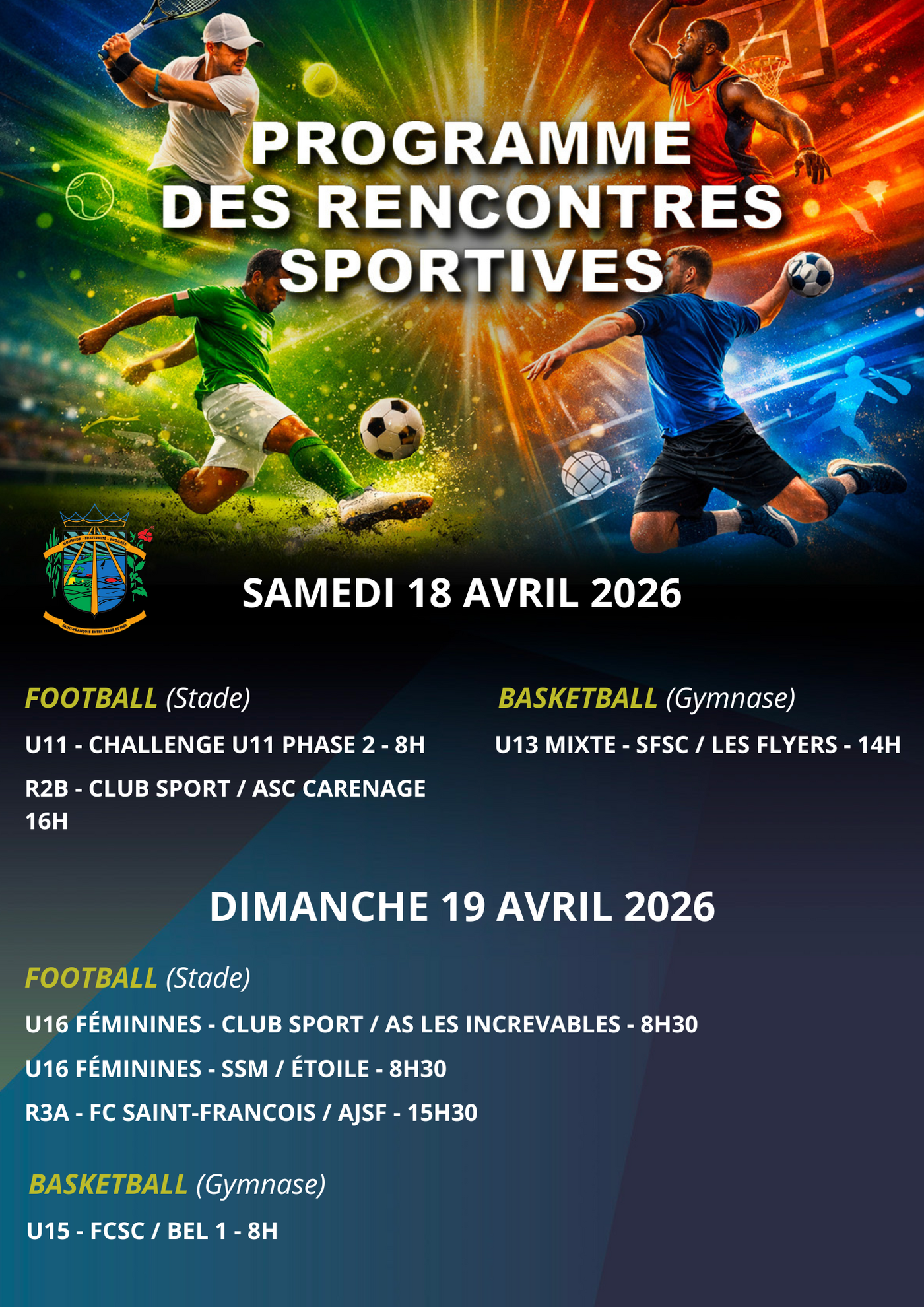 Découvrez le programme des rencontres sportives du week-end du 18 et 19 avril à Saint-François.
