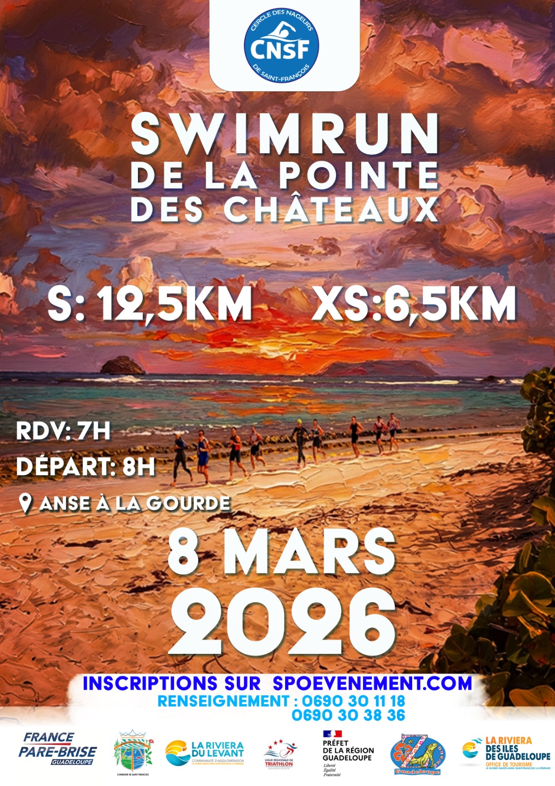 La SWIMRUN 2026 se déroulera le Dimanche 8 mars 2026 avec un départ depuis Anse à la Gourde à 8h. Deux compétitions en une, avec un format XS de 5, 5kms et un format S de 12, 5kms.