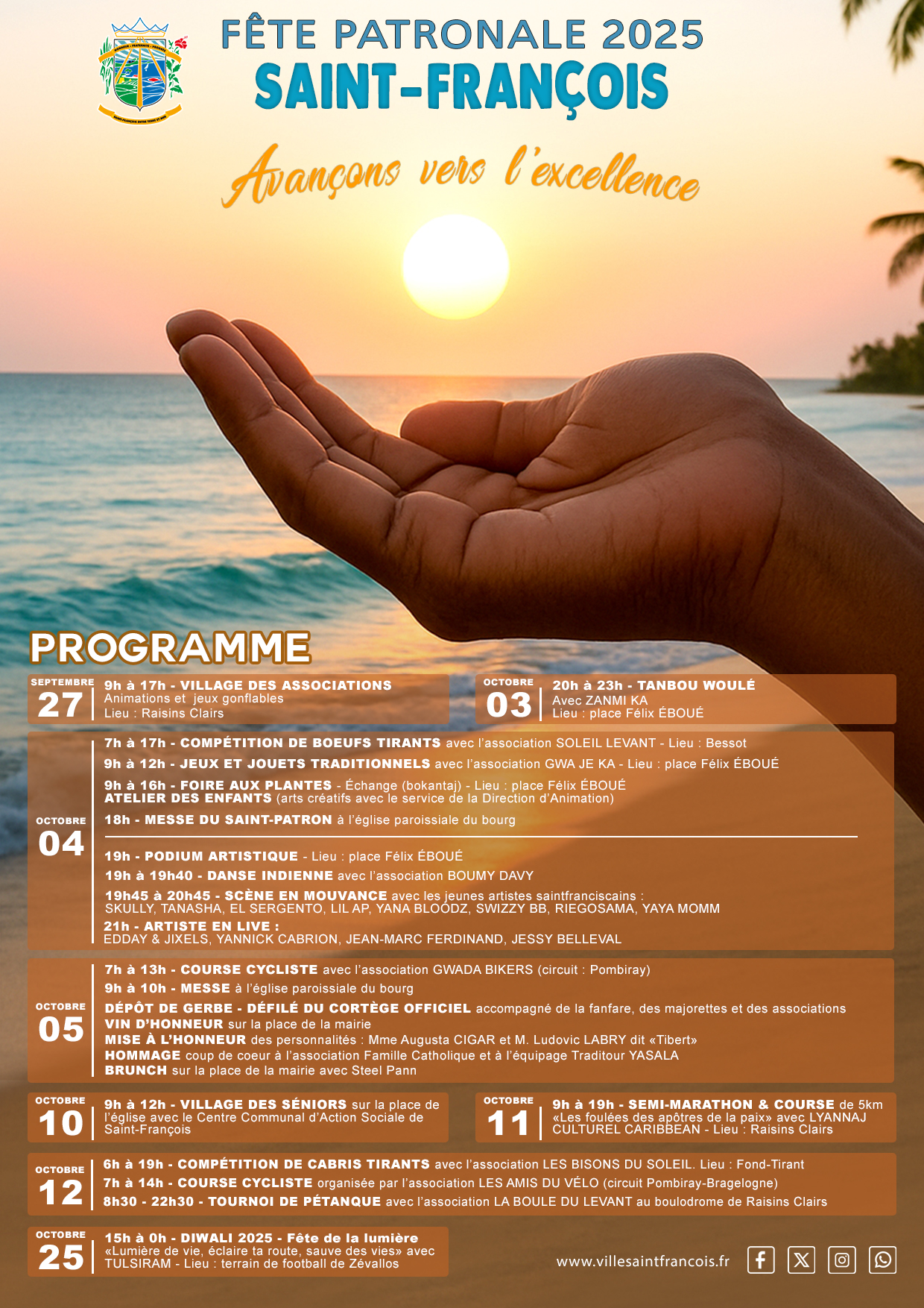 À l’occasion de la fête patronale de Saint-François, l’association TULSIRAM vous invite à découvrir et participer au DIWALI, fête de la lumière, le samedi 25 octobre 2025 de 15h00 à 0h00 au niveau du terrain de football de Zévallos.