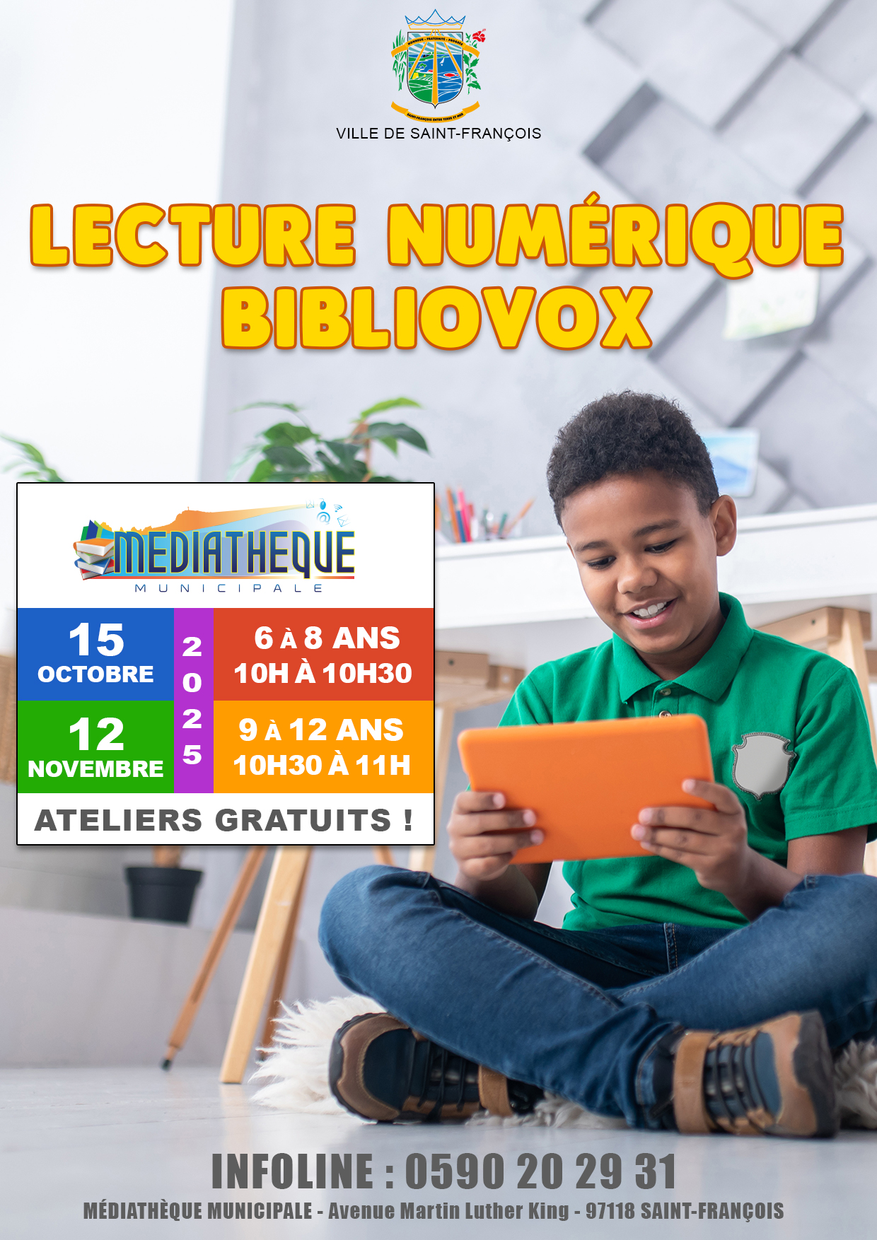 La Médiathèque Municipale de Saint-François organise des ateliers de lecture numérique pour vos enfants le 15 octobre et 12 novembre 2025.