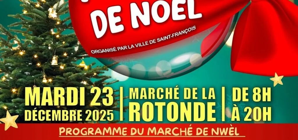 La ville de Saint-François organise son Marché de Noël à la Rotonde le mardi 23 décembre 2025 de 8h à 20h.