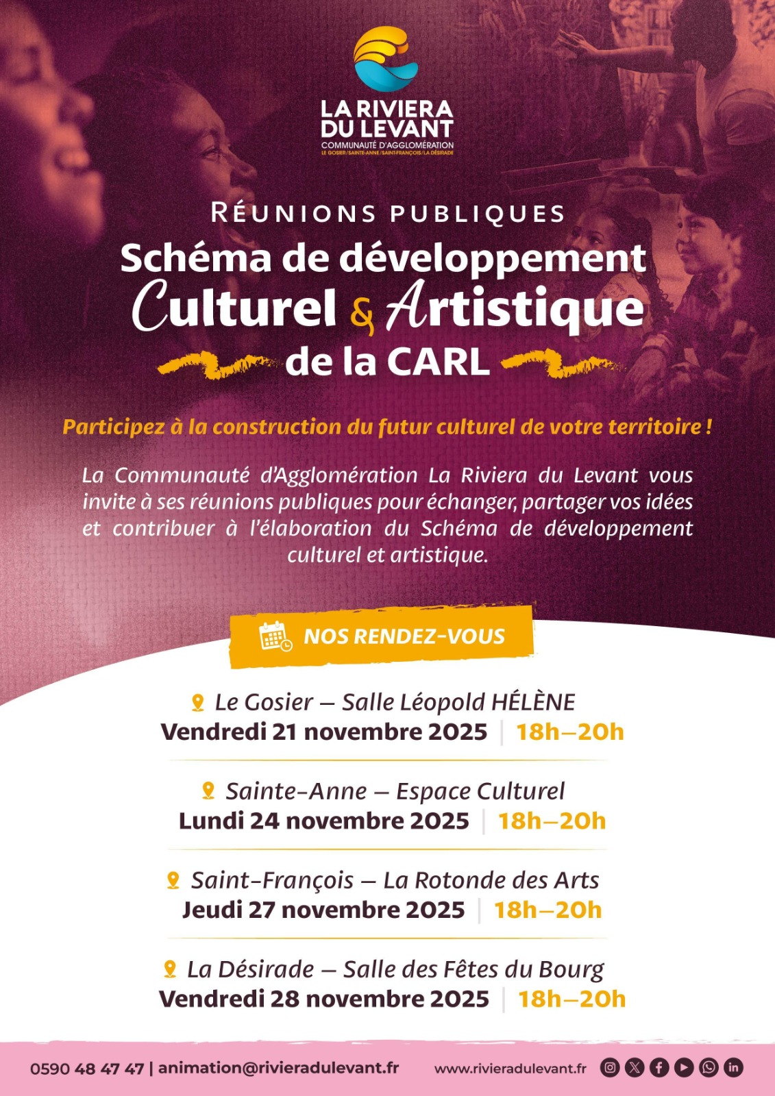 Associations de Saint-François, participez à la co-construction du Schéma de développement culturel et artistique de la CARL le jeudi 27 novembre 2025 de 18h à 20h à la Rotonde des Arts.