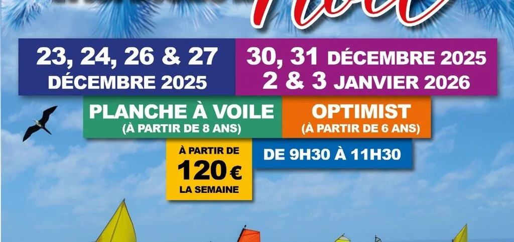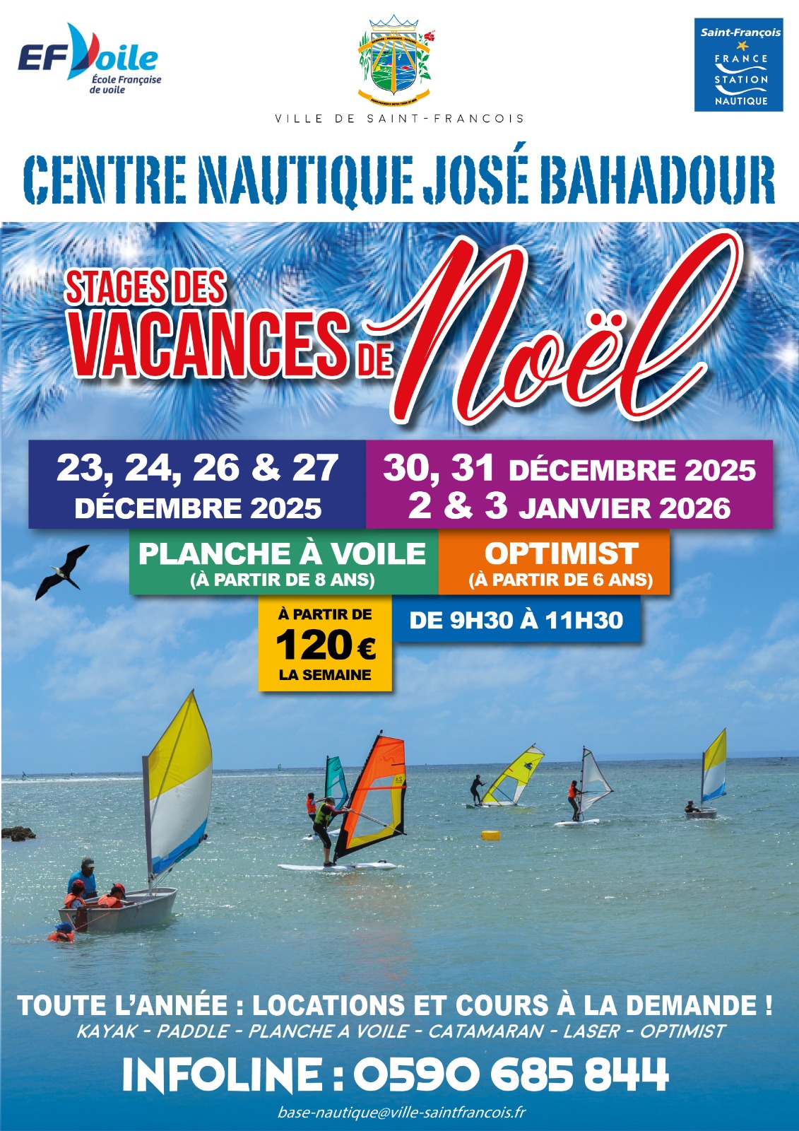 Le centre nautique de Saint-François propose des stages de planche à voile et d’optimist pour les enfants pendant les vacances de Noël ! Inscriptions : 0590 685 844