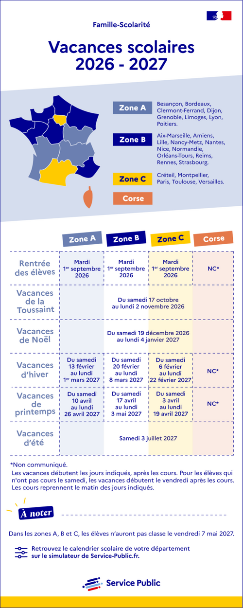 Dans les zones A, B et C, les élèves n'auront pas classe le vendredi 7 mai 2027.